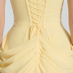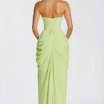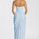 - Dizajn: Bustier silueta bez naramenica sa strukturiranim, horizontalno nabranim korzetom.