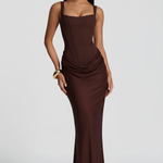 Predstavljamo ‘Sofija Maksimalnu’ – upečatljivu kombinaciju skulpturalne strukture i fluidne sofisticiranosti. Izrađena u bezvremenskoj dubokoj smešanoj boji, ova haljina ima predivno oblikovan korzet koji oblikuje i podržava, uparen sa rafiniranim ravnim dekolteom i podesivim suženim trakama koje okviruju dekolte sa suptilnom elegancijom. Čipkasti leđa dodaju romantičan, zategnut završetak koji osigurava besprekornu, krojenu prilagodbu.